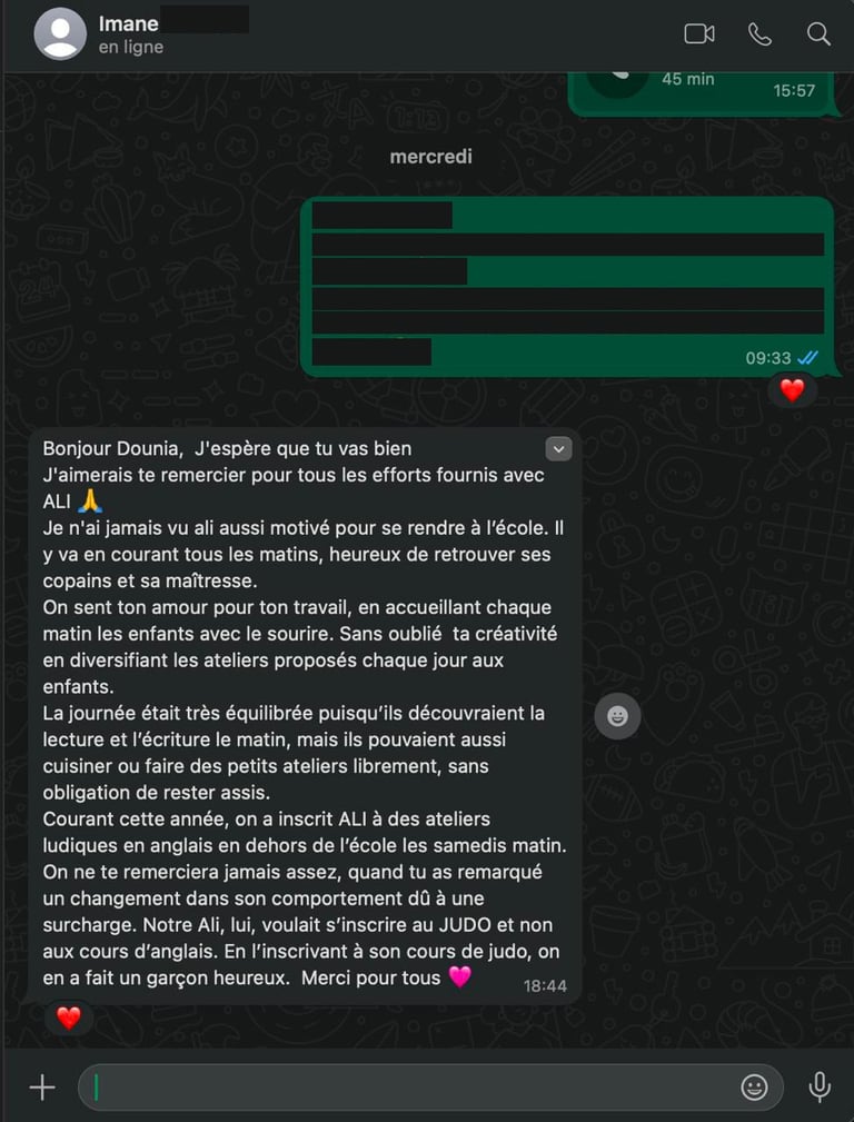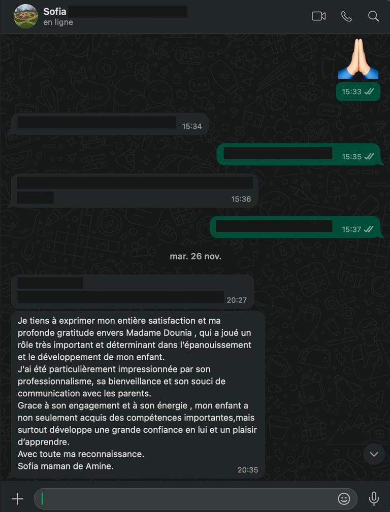 " Je tiens à exprimer mon entière satisfaction et ma profonde gratitude envers Madame Dounia, qui a joué un rôle très important et déterminant dans l’épanouissement et le développement de mon enfant.