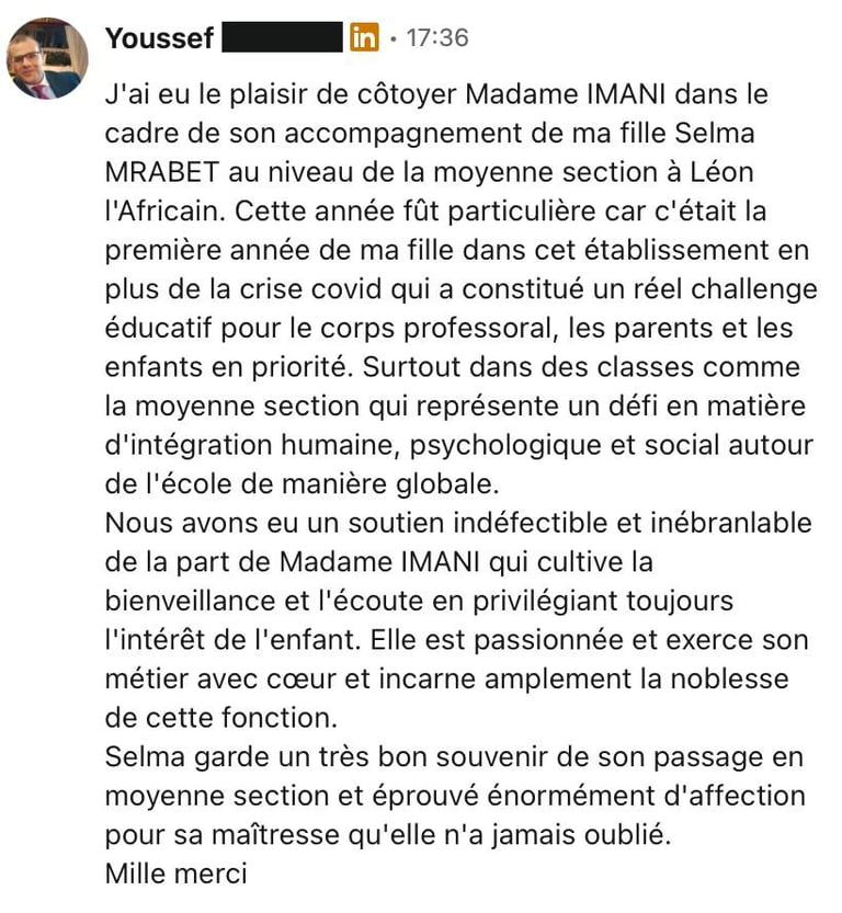 "J'ai eu le plaisir de côtoyer Madame IMANI dans le cadre de son accompagnement de ma fille Selma au niveau de la moyenne section à Léon l'Africain.
