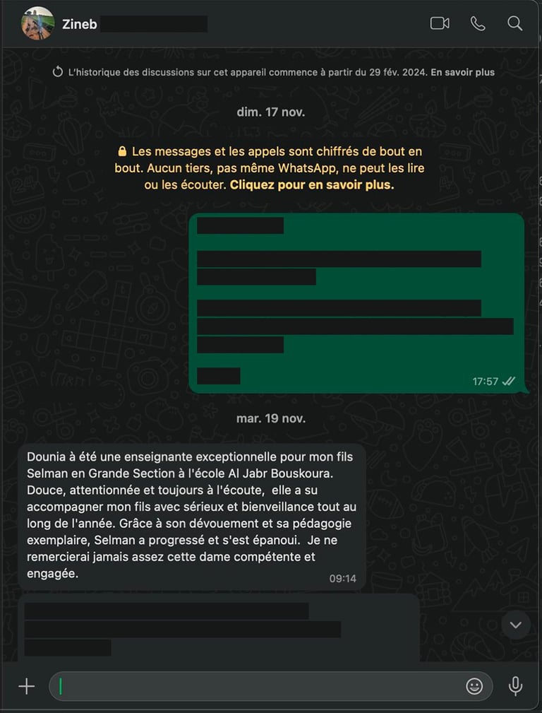 "Dounia à été une enseignante exceptionnelle pour mon fils Selman en Grande Section à l'école Al Jabr Bouskoura.